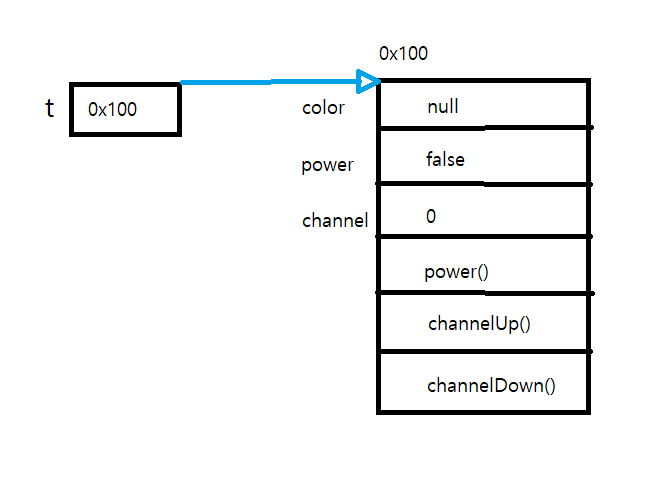 - 연산자 new에 의해 TV클래스의 인스턴스가 메모리의 빈 공간에 생성된다. 주소가 0x100인 곳에 생성되었다고 가정하고 멤버변수는 각 자료형에 해당하는 기본값으로 초기화 된다. 그 다음에는 대입연산자에 의해서 생성된 객체의 주소값이 참조변수 t에 저장된다.