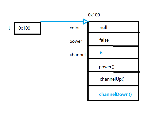 - 참조변수 t가 참조하고 있는 Tv인스턴스의 channelDown메서드를 호출한다. channel Down메서드는 멤버변수 channel에 저장되어 있는 값을 1 감소시칸다.