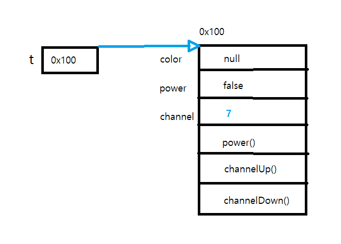 - 참조변수 t에 저장된 주소에 있는 인스턴스의 멤버변수 channel에 7을 저장한다.