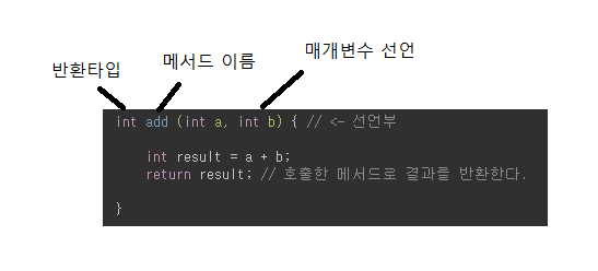 - 메서드는 크게 두 부분, '선언부'와 '구현부'로 이루어져 있다.