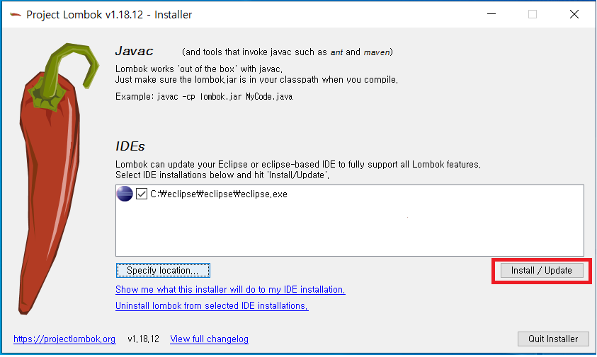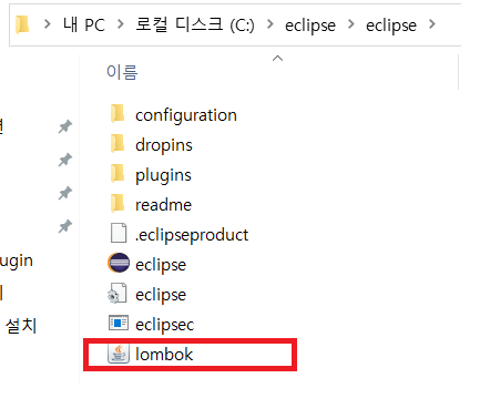 Eclipse 실행 경로에 lombok 파일이 추가된 것을 확인할 수 있습니다.